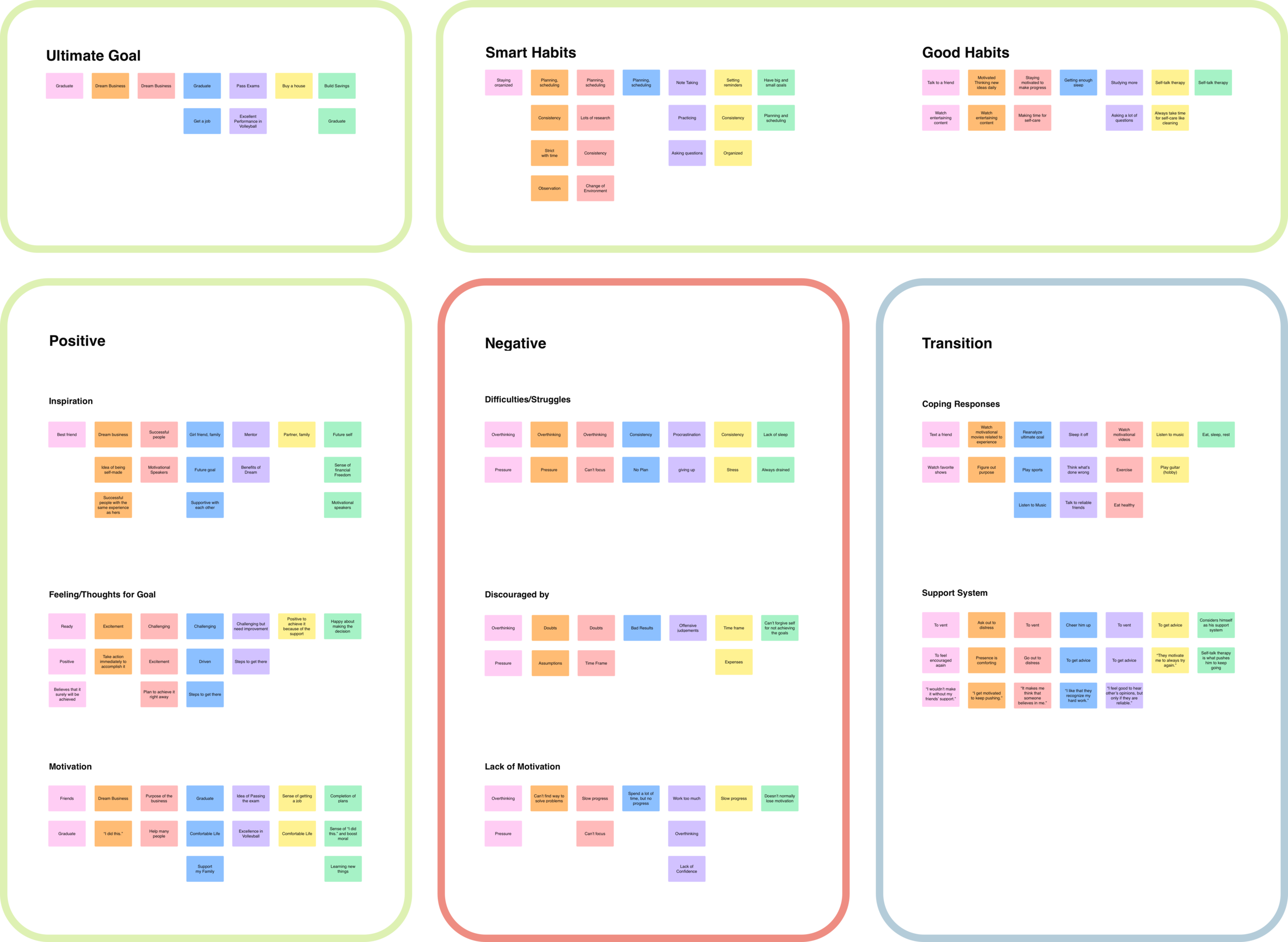 Red represents their concerns. Green represents their good habits. Blue represents the causes of lacking motivation.